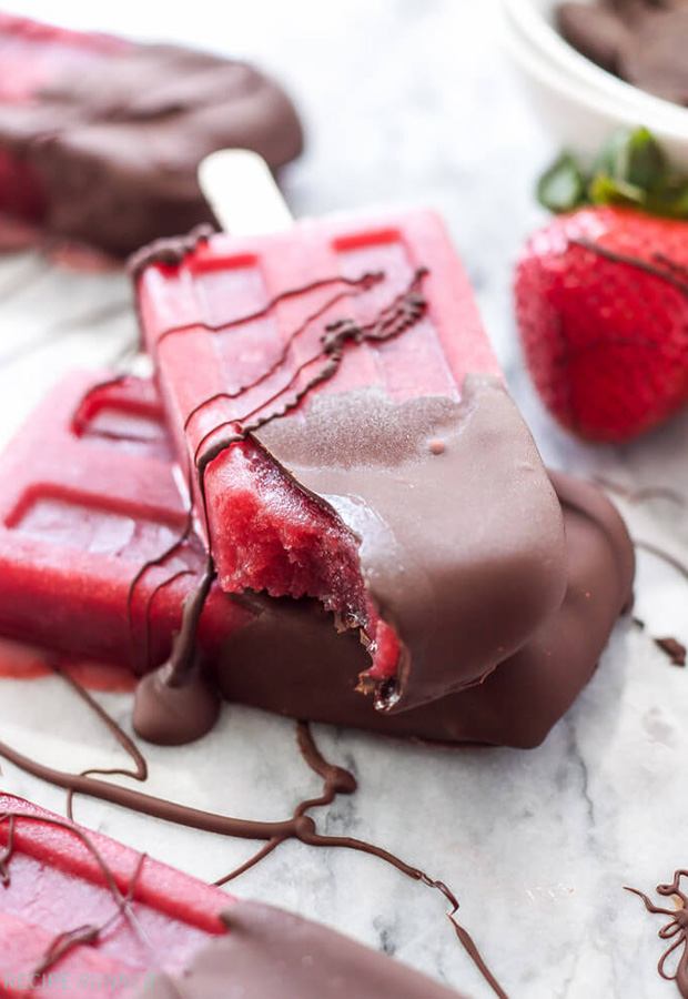 Remove the popsicles from the mold and dunk them in the melted chocolate.