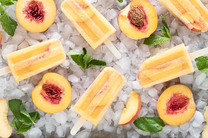 Pour puree mixture into popsicle molds, filling each about 1/2 way full. Place 1-2 peach slices into each mold and top with any remaining puree mixture. Cover and insert popsicle sticks.